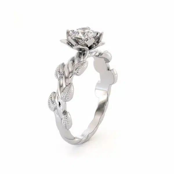 This blooming rose diamond ring blends natural inspiration with sculptural elegance. A full, blooming flower cradles the center stone, while lifelike leaves entwine the band in a romantic, symbolic display. Crafted with precision and charm, this piece is ideal for nature lovers and dreamers alike.