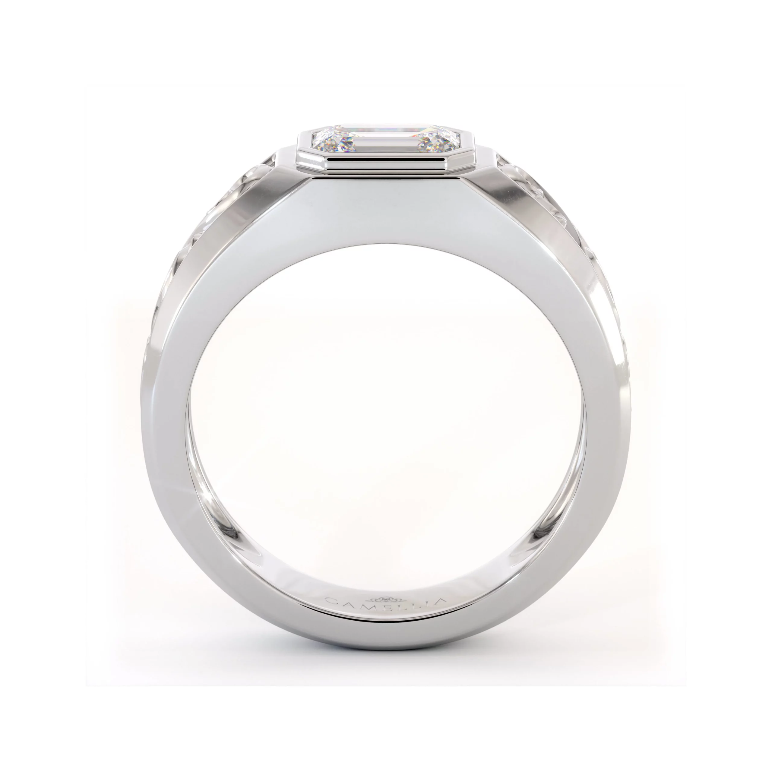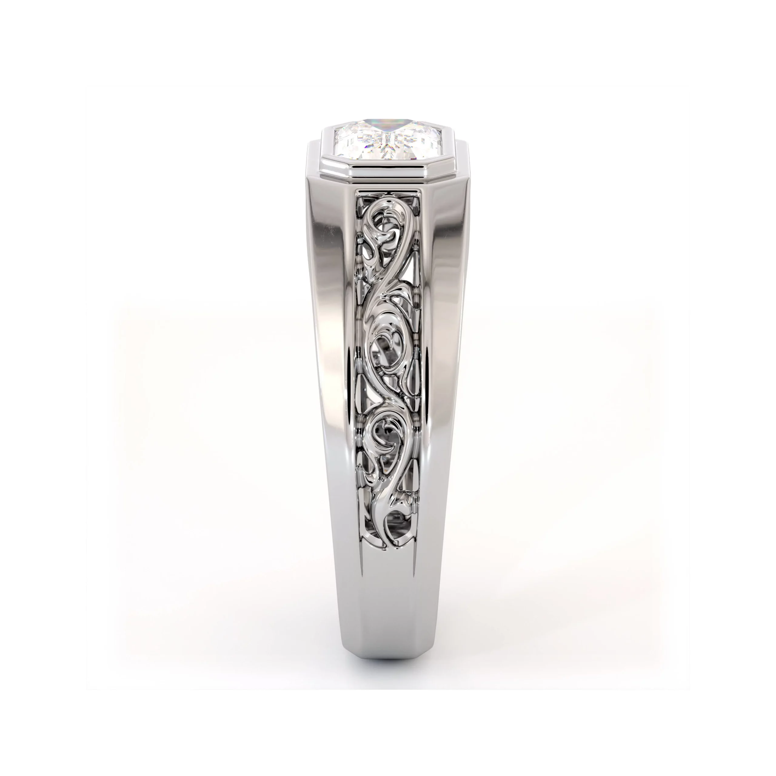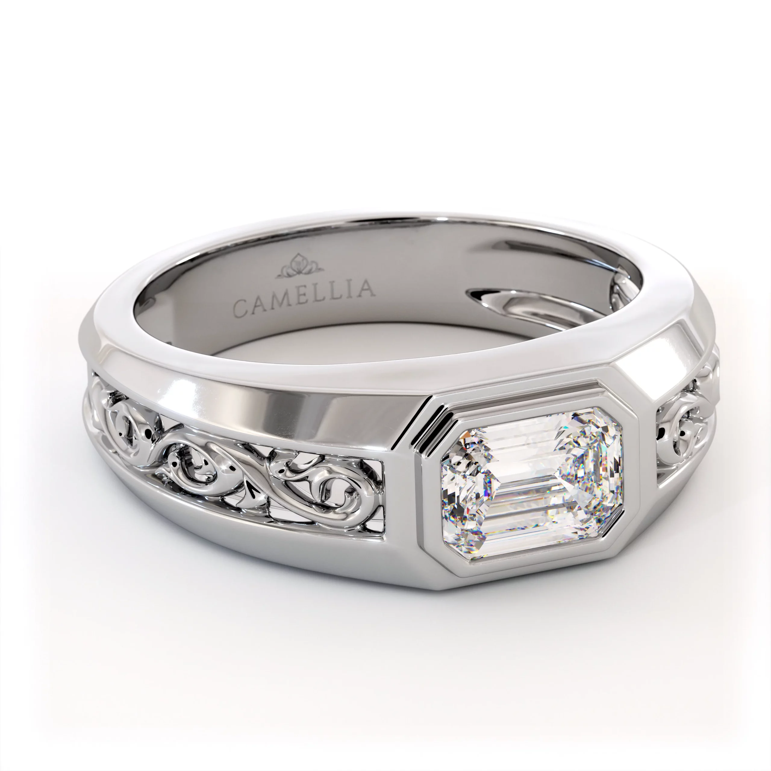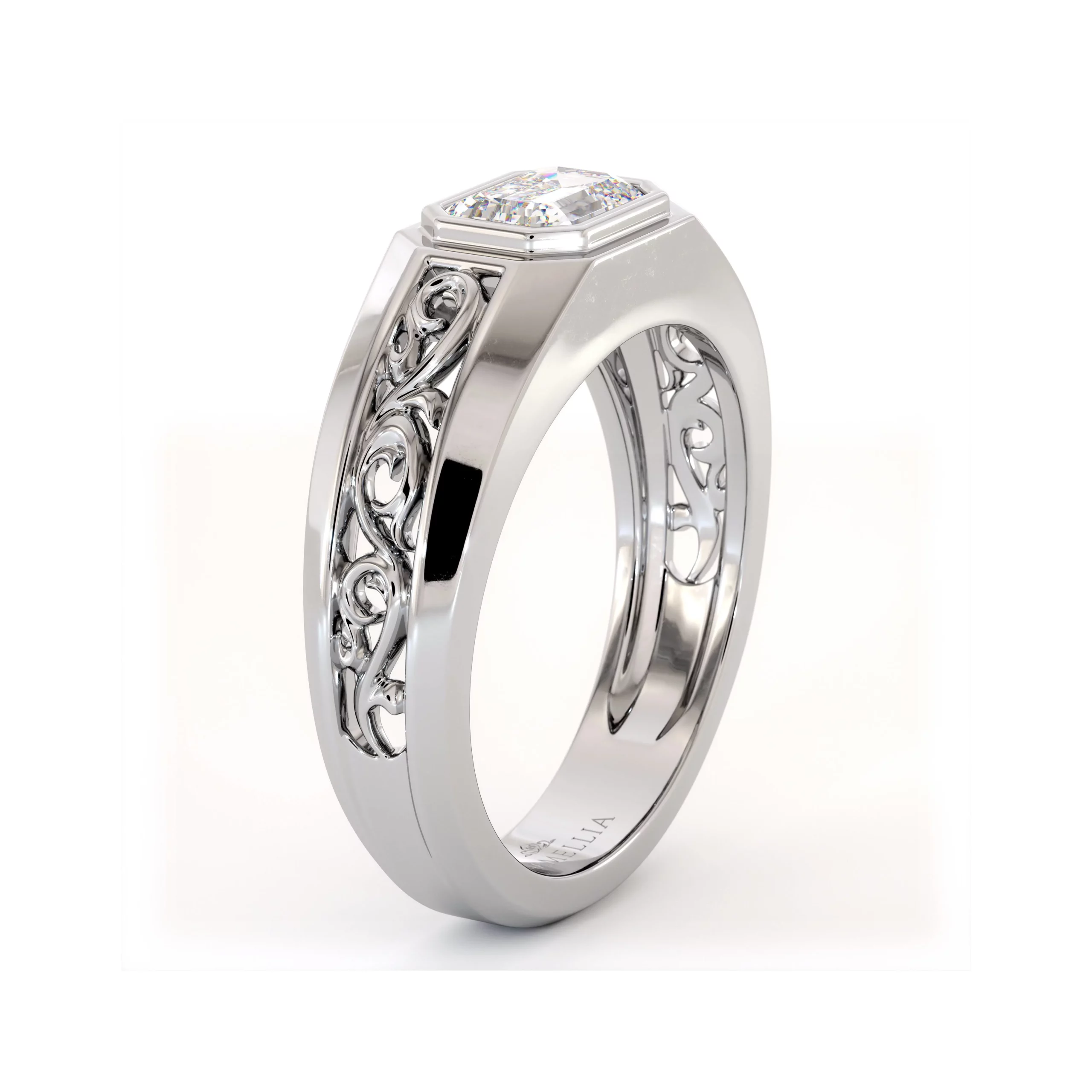 This emerald vintage filigree ring brings together timeless elegance and masculine artistry. The emerald-cut lab diamond glows at the center, framed by vintage-inspired filigree work. Every detail is hand-finished to achieve a balance of strength and refinement — a classic men’s ring that blends sophistication with enduring craftsmanship.